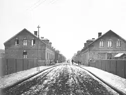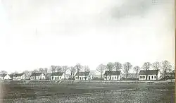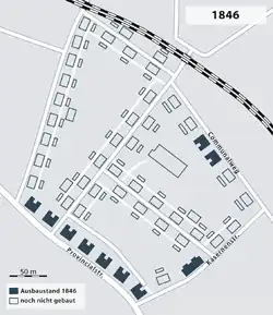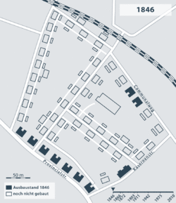 Zuletzt entstanden insgesamt elf Wohngebäude: Zunächst im Frühjahr 1846 sieben Meisterhäuser entlang der Provinzialstraße (heute Sterkrader Straße), im Spätsommer und Herbst folgten das Doppelhaus in der Kasernenstraße (heute Fuldastraße Nr. 5–7) und zwei zweistöckige Siedlungshäuser am Communalweg (heute Wesselkampstraße Nr. 27/29 und 31/33).[14]