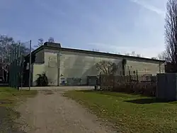 Die einstöckigen Toiletten-/Stall-Backsteingebäude stehen separat.