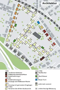 Die traufständigen, eineinhalbstöckigen Backsteinbauten hatten Hauseingänge an allen vier Seiten. Bei den älteren Häusern findet man ein Backsteinmuster über den Türen, ein mehrstufiges Backsteingesims mit Zahn- und Schrägschnittfriesen unterhalb der Traufe und ein Kassettenfries mit muschelförmigen Füllungen auf den Längsseiten des Halbgeschosses. Im Dachhalbgeschoss befinden sich Dachgauben.