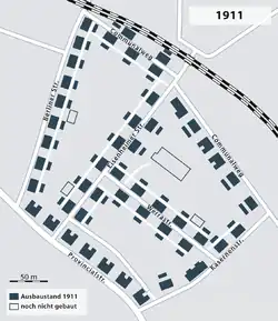 Dass in dieser Phase nur ein Haus errichtet wurde, spiegelt aber auch den Gründerkrach von 1873 wider. Die GHH reagierte mit der Entlassung von 1/3 der Beschäftigten. Der Ausbau der Siedlung wurde zunächst gestoppt. Die Siedlung bestand jetzt aus 21 Wohngebäuden.[18] Die Zahl der Haushaltungen hatte sich mit 66 in etwa verdoppelt, die Einwohnerzahl aber nahezu vervierfacht. Es lebten jetzt 224 männliche und 194 weibliche Personen in der Siedlung.[15]