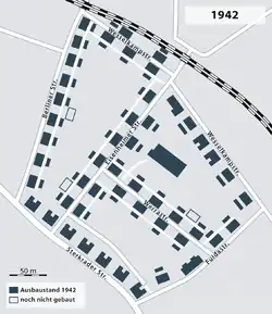 Zu Beginn des Zweiten Weltkriegs wurde 1942 ein Hochbunker in der Mitte der Siedlung errichtet. Am Abend des 30. März 1944 wurden 23 (nach anderen Quellen 41[25]) Menschen getötet und 32 weitere verletzt, als unmittelbar vor dem Bunkereingang eine einzelne, von einer De Havilland Mosquito abgeworfene Luftmine explodierte.[26] Durch Bombardierungen wurden während des Krieges mehrere Häuser völlig zerstört, darunter auch zwei der Meisterhäuser an der Sterkrader Straße. Die anderen Meisterhäuser zwischen Fuldastraße und Eisenheimer Straße wurden notdürftig repariert und waren bis 1952 bewohnt. Die Akten geben Beispiele für die katastrophale Situation. Ein Zechenarbeiter mietete den Stall eines zerstörten Meisterhauses an, da er zusätzlich zu seiner siebenköpfigen Familie auch noch die aus dem Osten geflohenen Verwandten unterbringen musste. Eine andere Familie, drei Erwachsene und zwei Kinder, lebten in der Waschküche eines zerstörten Meisterhauses. Auch der Bunker wurde bis in die 1950er-Jahre als Unterkunft genutzt.[27]