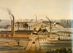 Puddlingswerk, Hochofen und Steinkohleberggruben Oberhausen um 1860. Die „Alte Walz“ im Vordergrund