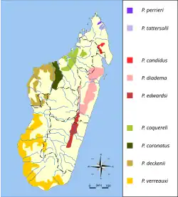 - verreauxi-Gruppe: Diese Arten sind kleiner und bewohnen den Westen und Südwesten Madagaskars: