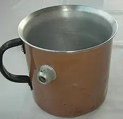 Eine weitere Ausführung besitzt eine an den Zwischenraum angeschlossene, abnehmbare Pfeife (Pfeiftopf), die das Sieden des dazwischen befindlichen Wassers anzeigt.
