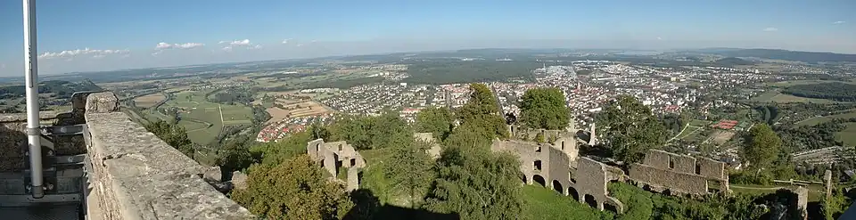 Singen wurde 787 als Sisinga erstmals urkundlich erwähnt.[8] Besitzungen hatte unter anderem das Kloster St. Gallen. Ab dem 11. Jahrhundert waren Edelfreie erwähnt, die sich ab 1170/80, nach ihrer neu erbauten Stammburg, der Burg Hohenfriedingen, als Herren von Friedingen bezeichnen und bis 1461 die Herren über Singen blieben. 1466 gelangte der Ort an die Familie von Fulach, 1518 an die von Klingenberg, am 28. November 1530 an die Herren von Bodman, von welchen es schließlich an Österreich verkauft wurde. 1571 waren wieder die Herren von Bodman die Ortsherren, dann ab 1607 die Herren von Reischach und schließlich 1632 wieder Österreich. Diese gaben Singen 1655 an Johann Gaudenz von Rost, der die Herrschaft Singen-Mühlhausen bildete. Diese gelangte durch Heirat an die Grafen von Enzenberg, die im 18. Jahrhundert in Singen ein Schloss errichteten. Als Teil der Grafschaft Nellenburg gehörten Dorf und Herrschaft Singen von 1465 bis 1805 zu Österreich.[9] Mit dem Friedensschluss von Preßburg kam Singen 1805 an das württembergische Oberamt Stockach und 1810 im Grenzvertrag zwischen Württemberg und Baden an das Großherzogtum Baden. Zunächst war Singen eine Gemeinde im Bezirksamt Radolfzell. Bei dessen Auflösung 1872 kam Singen zum Bezirksamt Konstanz.