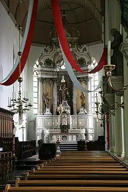 Von 1648 bis 1799 wurde die Kirche von der reformierten Gemeinde genutzt, danach wurde sie an die Katholiken zurückgegeben. Ein großer Teil der Innenausstattung, wie Statuen und Glasfenster, wurde entfernt, aber die Kanzel, die Kronleuchter und das Chorgestühl blieben erhalten. Die Katholiken vervollständigten die Innenausstattung danach wieder. Zu Beginn des 19. Jahrhunderts erwarben sie eine Reihe von Ausstattungsstücken.