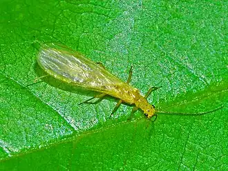 Der Körper wird bis 9 Millimeter lang und ist vollständig deutlich beborstet. Er ist gelblich bis hellbraun gefärbt. An Kopf und Pronotum sind dunklere Flecken vorhanden. Das Pronotum ist queroval und weist lange Randborsten auf. Die Flügelscheiden sind kurz, ihr Seitenrand ist konvex. Tracheenkiemen sind nicht vorhanden. An Femur und Tibia finden sich starke Borstensäume. Das erste und das zweite Tarsenglied sind gleich lang. Das dritte Tarsenglied ist dreimal so lang wie erstes und zweites zusammengenommen.