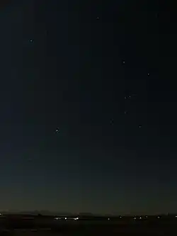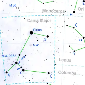 Sirius, Bayer-Bezeichnung α Canis Majoris (Alpha Canis Majoris, α CMa), auch Hundsstern, früher auch Aschere oder Canicula genannt,[12] ist ein Doppelsternsystem des Sternbildes „Großer Hund“. Er ist der hellste Stern am Nachthimmel, beinahe doppelt so hell[A 4] wie der zweithellste Stern Canopus. Von allen Himmelsobjekten erscheinen nur Sonne, Mond sowie die Planeten Venus, Jupiter, Mars und Merkur heller.[A 5] Im Wintersechseck markiert Sirius die südlichste Ecke.