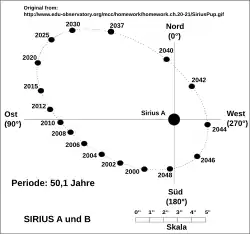 Da die Bahn jedoch um 136,62° gegen die Sichtlinie geneigt ist,[6] sieht der Beobachter die Bahn in Schrägansicht, die sich wiederum als Ellipse, aber mit etwas größerer Exzentrizität darstellt. Die Abbildung zeigt diese scheinbare Bahn, wie sie von der Erde aus gesehen erscheint. Obwohl Sirius A in einem Brennpunkt der relativen Umlaufbahn von Sirius B liegt, befindet er sich wegen der Schrägansicht nicht in einem Brennpunkt der im Diagramm dargestellten perspektivisch verkürzten Ellipse. Aufgrund der Schrägansicht erscheinen dem Beobachter die größtmöglichen und kleinstmöglichen Winkelabstände, die Sirius B auf dieser scheinbaren Bahn durchläuft, etwas kleiner als die oben angegebenen unverzerrten Werte. Sirius B passierte auf seiner wahren Bahn den geringsten Abstand zu Sirius A (das Periastron) das letzte Mal im Jahre 1994,[6] erreichte auf der scheinbaren Bahn den verkürzungsbedingt geringsten Abstand jedoch bereits 1993.[38]