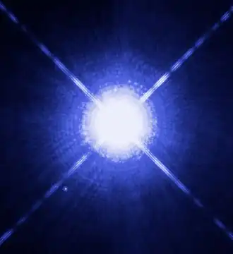 | Sirius A und Sirius B vom Hubble-Weltraumteleskop aufgenommen. Sirius B ist der kleine leuchtende Punkt unten links. | ||||||||||||||||||||||||||||||||||||||