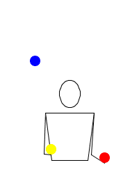 - rechte Hand: 3; hier haben wir eben den roten Ball gefangen, der bei Takt 2 geworfen worden war, und wir werfen ihn wieder so hoch, dass er nach Ablauf der jetzt nächsten drei Takte (also in 8) mit der linken Hand geworfen wird.