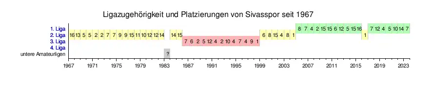 Sivasspor ist ein Fußballverein aus der türkischen Stadt Sivas der gleichnamigen zentralanatolischen Provinz. Der Verein wurde im Jahr 1967 gegründet und hat die Vereinsfarben rot und weiß. In den Jahren 2005 bis 2016 spielte er insgesamt 11 Spielzeiten in der Süper Lig. In der Ewigen Tabelle dieser Lig liegt der Verein auf dem 22. Platz.[1] Seine erfolgreichste Zeit in der Süper Lig hatte der Verein in den Jahren 2007 bis 2009. In dieser Zeit spielte er bis zum Saisonende um die türkische Meisterschaft mit und verfehlte sie in den letzten Spieltagen. Während die Saison 2007/08 als Tabellenvierter abgeschlossen wurde, wurde in der Saison 2008/09 mit der Vizemeisterschaft der größte Erfolg der bisherigen Vereinshistorie erreicht. Daneben wurde in der Spielzeit 2013/14 der 5. Tabellenplatz der Süper Lig belegt. Als weitere wichtige Erfolge sind die drei Halbfinalteilnahmen im türkischen Pokal der Spielzeiten 2008/09, 2012/13 und 2014/15 hervorzuheben bis dann, in der Saison 2021/22, mit dem türkischen Pokal der erste Titel gewonnen wurde.