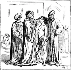 Die Orientmotive des Malers standen nicht zuletzt unter dem Eindruck seiner Reisen in den Nahen Osten, die er 1856 und 1862 unternommen hatte. Gérôme weilte jeweils für mehrere Monate in Ägypten und seinen Nachbarländern, studierte Landschaften und Baudenkmale und beobachtete die dort lebenden Menschen. Die im Nahen Osten entstandenen Skizzen dienten später in Europa neben zeitgenössische Fotografien als Vorlage für seine Gemälde. Die vor Ort erlangten Kenntnisse brachten ihm in Frankreich viel Ruhm ein. So lobte Maxime Du Camp, der selbst den Nahen Osten bereist und dort auch fotografiert hatte, Gérômes Sklavenmarkt für seine realistische Darstellung. In seiner in der Revue des Deux Mondes erschienenen Kritik Le Salon de 1867 hob er die genaue Beschreibung in Gérômes Gemälde hervor. Auch glaubte er, den Ort des Bildes exakt wiederzuerkennen. Demnach sei das Motiv in den Ruinen der al-Hakim-Moschee in Kairo angesiedelt. Zudem urteilte Du Camp über die im Bild gezeigte nackte Frau, sie sei eine Abessinierin und gehöre somit zu den teuren Sklavinnen. Der Maler habe sie geschickt als unterwürfig, demütig und resigniert dargestellt.[8] Diese positive Einschätzung des Gemäldes teilten nicht alle Zeitgenossen. So schuf der Karikaturist Cham eine Zeichnung nach Géromes Gemälde, die er 1867 in der Zeitschrift Le Charivari veröffentlichte. Darunter fügte er die parodierende Unterschrift hinzu: „M. GÉROME. Un Arabe qui a mal aux dents achète un esclave pour lui mâcher son dîner.“ (sinngemäß: Ein Araber mit Zahnschmerzen kauft eine Sklavin, damit sie für ihn das Abendessen kaut).[9]