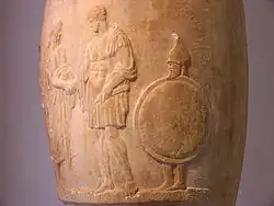 Grabritual-Loutrophoros, 380–370 v. Chr. Der bärtige Sklave rechts trägt den Helm und Schild seines Herrn.