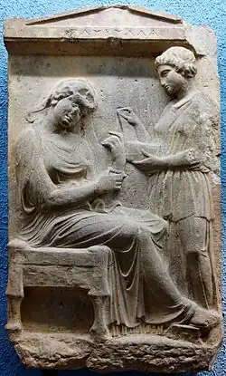 Eine junge Sklavin reicht ihrer Herrin ein Schmuckkästchen. Grabstele, 430–410 v. Chr.