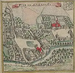 | 1840 | 444 | davon 218 Evangelische (mit der Schlossgemeinde: 294 Einwohner, davon 144 Evangelische)[11] |