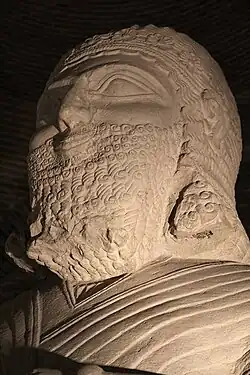 F3 | A/12 | im Bereich des Löwentors | liegend im Löwentor (siehe Bild oben) | Museum Ankara | Höhe 380 | ? später als Mal. I–II | Statue eines Königs. Der König trägt einen Umhang über einem langen Gewand, dessen Fall und die Falten deutlich modelliert sind. Er hält in der vorgestreckten rechten Hand ein Gefäß, die linke hält vor dem Körper einen Zipfel des Umhangs. Bart und die von einem Diadem zusammengehaltenen Haare mit einer Locke im Nacken weisen deutlich assyrische Einflüsse auf. Auch das Gesicht zeigt eine sorgfältige Darstellung der Einzelheiten in Eintiefungen und Vorsprüngen. Die Art der Gestaltung ordnet die Statue eindeutig in spätere Zeit als die Orthostaten ein. Benno Landsberger schlägt auf Grund von Ähnlichkeiten mit einem Relief aus Sakçagözü eine Identifizierung mit Mutallu von Kummuḫ vor, der im späten 8. Jahrhundert v. Chr. im assyrischen Auftrag in Melid (Arslantepe) herrschte.[48][49] | keine |
