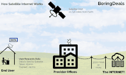 Internet über Satellit basiert im Allgemeinen auf drei Hauptkomponenten: Satelliten, die sich früher hauptsächlich im geostationärem Orbit (oder GEO) befanden, nun aber zunehmend in niedrigen Erdorbits (LEO) oder mittleren Erdorbits (MEO)[1] platziert werden, mehreren Bodenstationen, bekannt als Gateways, die Internetdaten über Radiowellen (Mikrowellen) vom und zum Satelliten weiterleiten, und weiteren Bodenstationen, die jeden Abonnenten mit einer Antenne und Transceiver bedienen. Weitere Komponenten eines Satelliteninternetsystems umfassen ein Modem auf der Seite des Benutzers, das das Netzwerk des Benutzers mit dem Transceiver verbindet, und ein zentrales Network Operations Center (NOC) zur Überwachung des gesamten Systems. Zusammen mit einem Breitband-Gateway betreibt der Satellit eine Sternnetzwerk-Topologie, bei der alle Netzwerkkommunikation über den Hub-Prozessor des Netzwerks verläuft, der im Zentrum des Sterns steht. Mit dieser Konfiguration ist die Anzahl der Bodenstationen, die mit dem Hub verbunden werden können, praktisch unbegrenzt.