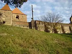 - Die Burgruine der Fliehburg auf einem Berg oberhalb des Ortes, im 15. Jahrhundert von den Siebenbürger Sachsen errichtet. Die Burg, mit den hohen Ziegelmauern mit doppeltem Schießschartenkranz, wurde um eine nie vollendete gotische Saalkirche – im Norden ein viereckiger, im Süden ein dreieckiger Burg- mit Brunnenhof – erbaut,[9] steht unter Denkmalschutz.[4]