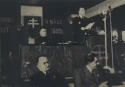 Inzwischen war es in der Hlinka-Garde zu einer Teilung des radikalen Lagers gekommen. Der Nástup-Kreis um Ferdinand Ďurčanský war aus seiner nationalistischen Haltung heraus immer weniger dazu bereit, sich bei der slowakischen Staatlichkeit mit NS-Deutschland auf Kompromisse einzulassen. Er schlug sich auf die Seite der Klerikalen Tisos. Dagegen propagierten die Hlinka-Gardisten um Tuka, Mach und Murgaš die enge Bindung an das Deutsche Reich und verpflichteten sich zusehends der Terminologie der Nationalsozialisten.[37] Jozef Tiso, der die Nástupisten offen präferierte, fungierte als Bindeglied zwischen Klerikalen und Nástup-Radikalen. Auf dem Parteitag der Ludaken in Trenčín Anfang Oktober 1939 konnte er den Parteivorstand mehrheitlich mit klerikalen Gefolgsleuten besetzen. Gleichzeitig zementierte Tiso sein Bündnis mit dem Nástup-Kreis, indem er den Nástupisten Jozef Kirschbaum zum Generalsekretär der Hlinka-Partei ernannte. Als Ende Oktober 1939 durch die Wahl Tisos zum Staatspräsidenten eine Kabinettsumbildung notwendig wurde, gingen das Innen- wie das Außenministerium an Ďurčanský, statt an die Gefolgsleute Tukas. Dadurch war Ďurčanský zum mächtigsten Mann im Kabinett geworden.[38]