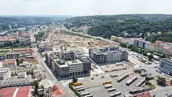 Die Richtlinien des Architekturwettbewerbs wurden durch die Tschechische Architektenkammer (Česká komora architektů) festgelegt. An der Auftragsvergabe beteiligte sich auch das Planungs- und Entwicklungsinstitut der Hauptstadt Prag (Institut plánování a rozvoje hl. m. Prahy).[7] In der ersten und in der zweiten Bauetappe werden Gebäude errichtet, die in den Erdgeschossen sämtlich über offene Gewerberäume für Geschäfte, Dienstleistungen, Restaurants und Cafés verfügen. Der Fußgängerboulevard führt durch zwei Parks mit einer Gesamtfläche 1,4 ha.[8]
