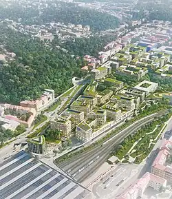 Vom Fußgängerboulevard führt eine Fußgängerbrücke über die Eisenbahnstrecke hin zum modernisierten Bahnhof Smíchov, dessen Bau 2024 begann und 2027 vollständig fertiggestellt sein soll.[9] Der Smíchov-Terminal wird der erste moderne Bahnhof in Prag und ein einzigartiger Verkehrsknotenpunkt sein, an dem täglich eine Viertelmillion Menschen abgefertigt werden. Die Stadt Prag plant, über 7 Milliarden Kronen zu investieren.[10] Neben der Metrostation wird es Terminals für den öffentlichen Nah- und Fernverkehr, einen Fahrradparkplatz und ein großes Parkhaus mit direkter Anbindung an den Stadtring geben. Zuerst soll ein Parkhaus mit 1 000 Stellplätzen gebaut werden, auf dessen Dach ein Terminal für Nah- und Fernbusse entstehen soll. Auf einem Teil des derzeitigen Busbahnhofs Na Knížecí erwägt die Stadt den Bau eines neuen städtischen Gebäudes, in dem 2 000 Beamte des Škoda-Palastes untergebracht werden sollen, wenn der Mietvertrag im Jahr 2028 ausläuft.[11] Die Eisenbahnverwaltung wird sich am Bau des Smíchov-Terminals beteiligen, für den Investitionen von 5,1 Milliarden Kronen aus öffentlichen Mitteln geplant sind. Die historische Bahnhofshalle aus den 1950er Jahren soll erhalten bleiben und die beiden Bahnhofsunterführungen miteinander verbinden. Das Terminal ist Teil anderer Modernisierungsprojekte wie einer dreigleisigen Eisenbahnbrücke über die Moldau, neuen Hochgeschwindigkeitsstrecken sowie der Metro S oder der Elektrifizierung von Buslinien und Ladestationen.[12]