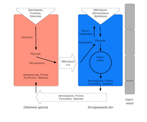 Gilliamella apicola ist ein Bakterium, das Zucker abbaut und Carbonsäuren produziert (saccharolytischer Fermenter), während Snodgrassella alvi Carbonsäuren oxidiert. Im Darm bilden sie ein Netzwerk zur Aufteilung der Stoffwechselressourcen, bei dem beide Arten jeweils von den Eigenschaften der anderen profitieren. Gilliamella apicola wandelt entsprechend einfache Kohlenhydrate (Zucker) durch Glykolyse in Energie um und übergibt die übrig gebliebenen Moleküle an Snodgrassella alvi, die die notwendigen Gene für den Krebszyklus hat und diese nutzt, jedoch keine Glykolyse durchführen kann. Beide Arten besitzen zudem zahlreiche Gene und Proteine, die die Darmkolonisation sowie Interaktionen zwischen den Bakterienzellen ermöglichen.[4]