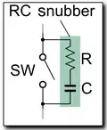 Nachteil: Im geöffneten Zustand fließt bei Wechselstrom, bedingt durch den Wechselstromwiderstand (Impedanz) des Kondensators, immer ein Strom durch den Snubber und den Verbraucher. Das kann in einigen Fällen vermieden werden, indem das Snubberglied direkt über den (induktiven) Verbraucher geschaltet wird. Da in diesem Fall die Impedanz des speisenden Netzes in Reihe liegt (das Niederspannungsnetz ist meist induktiv!), verringert sich die Entstörwirkung. Das kann durch einen weiteren, über die Speisequelle geschalteten Kondensator (sog. „X-Kondensator“, oft Bestandteil des Netzfilters) vermieden werden.