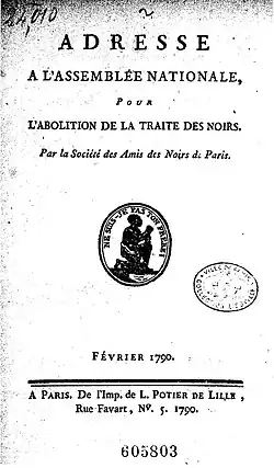 - Société des Amis des Noirs: Adresse à l’Assemblée nationale, pour l’abolition de la traite des Noirs. L. Potier de Lille, Paris 1790