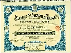 Da sich der Fremdenverkehr seit der Jahrhundertwende gut entwickelt hatte, plante man den Bau weiterer Bahnverbindungen zu den gut besuchten Strandbädern entlang der Küste bis zur spanischen Grenze und darüber hinaus. Im Jahr 1910 gründete man mit belgischem Kapital die S. A. de Tramways Électriques Biarritz-St. Sebastién-Tolosa, die sich bald darauf den neuen Namen Société des Chemins de fer et des Tramways Électriques des Basses-Pyrénées et du Pays-Basque zulegte. Doch musste sie ihre Ziele bald aufgeben und wurde aufgelöst.