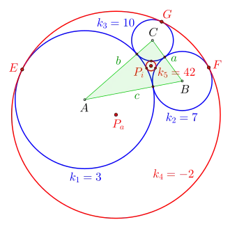 - Hierbei bezeichnen die Krümmungen (= Kehrwerte der Radien) der Kreise um die Eckpunkte A, B und C.