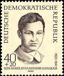 Soja Anatoljewna Kosmodemjanskaja (russisch Зо́я Анато́льевна Космодемья́нская; * 13. September 1923 in Ossino-Gai, Gouvernement Tambow; † 29. November 1941 in Petrischtschewo, Oblast Moskau) war eine sowjetische Partisanin im Zweiten Weltkrieg und Heldin der Sowjetunion[1]. Ab 1942 wurde sie zu einer Art Ikone des sowjetischen Widerstandes gegen die deutschen Invasoren.