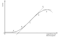 Fotografische Materialien weisen einen typischen Verlauf der Schwärzungskurve auf. Diese beschreibt das Verhältnis zwischen der Belichtung und der daraus folgenden Schwärzung, der Dichte, ist aber unter anderem auch von den Entwicklungsbedingungen abhängig. Die vereinfachte Grafik rechts zeigt zwischen den Punkten A und B den Bereich der Unterbelichtung eines Negativfilms sowie den normalen Arbeitsbereich B bis D. Rechts vom Punkt D kann die lichtempfindliche Schicht die weiter zunehmende Belichtungsstärke nicht mehr adäquat umsetzen, bis schließlich beim Punkt E die maximal mögliche Dichte erreicht ist.
