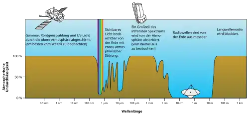 Die Intensität der Sonnenstrahlung ist am Boden geringer als außerhalb der Atmosphäre, deren Absorption und Streuung stark wellenlängenabhängig ist: Der vom menschlichen Auge wahrnehmbare Anteil, welcher knapp die Hälfte der solaren Strahlung ausmacht, erreicht bei klarem Wetter und hohem Sonnenstand zum größten Teil die Erdoberfläche. Die nicht sichtbare Strahlung ist ganz überwiegend nahe Infrarotstrahlung (NIR), die ca. 46 % der Strahlungsleistung ausmacht[2] und zu etwa einem Viertel in der Atmosphäre absorbiert wird, hauptsächlich durch Wassermoleküle. Von der Ultraviolettstrahlung, welche weniger als 10 % der Strahlung ausmacht, dringt UVA weitgehend durch, hauptsächlich geschwächt durch Rayleigh-Streuung, die auch dafür verantwortlich ist, dass der Himmel blau ist und man im Halbschatten braun wird. UVB wird von der Ozonschicht stark absorbiert, UVC von Luftsauerstoff.