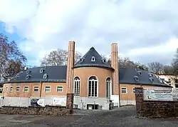Das Badehaus von 1925 ist das zentrale Gebäude der von Wilhelm Jost geschaffenen Anlage. Es wurde in der Art barocker Lustschlösser auf U-förmigem Grundriss mit hohen Walmdächern als eingeschossiges Gebäude errichtet, an dessen Enden zwei zweigeschossige Kopfbauten den Abschluss bilden. Das Halboval öffnet sich zu einer Parkanlage. Ein ovaler Mittelpavillon mit großen Rundbogen-Fenstern bildet im Scheitel des U-förmigen Badehauses den Hauptzugang.