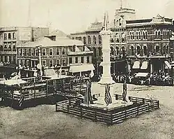Man wählte den Centre Square, wie der heutige Penn Square damals genannt wurde, als Standort für das neue Monument. Es wurde am 4. November 1872 in Auftrag gegeben[3] und am 4. Juli 1874 öffentlich enthüllt. Ursprünglich war es von einem Palisadenzaun und nicht befestigten Wegen umgeben. Der damalige US-Präsident Grant übermittelte sein Bedauern, an der Zeremonie nicht teilnehmen zu können. Zur Menschenmenge, die der Enthüllung des Denkmals beiwohnten, gehörten Veteranen aus dem Bürgerkrieg und eine Gruppe von Mädchen aus dem Soldatenwaisenhaus in Mount Joy. Das Soldiers and Sailors Monument wurde um 13:00 Uhr enthüllt, und die Waisenkinder sangen das Lied „My Father’s Grave“. „The Genius of Liberty“ auf der Säule war in die Stars and Stripes gehüllt.[1]