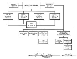 Außerdem stehen dem Solicitor General noch 17 Assistenten bei. Typischerweise werden die wichtigsten Fälle vor dem Obersten Gerichtshof vom Solicitor General verhandelt, während bei weniger wichtigen ein Stellvertreter oder Assistent einspringt.
