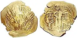 - ↑ Vorderseite jeweils: +IhS XIS RЄX RЄGNANTIh'm Bärtige Christusbüste von vorne mit Nimbus, mit der Linken Evangelienbuch haltend. Rückseite jeweils: +ΘЄOTOC 'b' HQ nICHF, dЄS' Kaiser, im Loros und mit Kreuzkrone, und Muttergottes, im Maphorion und mit Nimbus von vorne, gemeinsam ein Doppelkreuz haltend, im Felde M-Θ. Siehe auch David R. Sear: Byzantine Coins and Their Values. 1987, ISBN 0-900652-71-3, Sear Nr. 1778 links Sear Nr. 1780 rechts.
