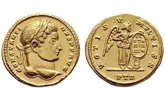 - ↑ Inschrift CONSTANTI-NVS P(ius) F(elix) AVG(ustus) auf der Vorderseite und VOTIS • V • - MVLTIS X / P TR (VOTIS Quinquennalibus - MULTIS Decennalibus / Percussa TReveris = „Glückwünsche dem Kaiser zum fünften Kaiserjubiläum und viele mehr zum kommenden zehnten Jubiläum – geschlagen in Trier“) auf der Rückseite.