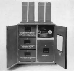 Das gesamte Zubehör des Teigknetanhänger wurde in einem Zubehörschrank untergebracht und auf der Zugmaschine mitgeführt. Der Zubehörschrank war aus Kiefernholz oder Sperrholz gefertigt und durch eine Zwischenwand in zwei Hälften unterteilt. In der linken gab es drei Schubkästen mit den Nummerierungen 1, 2 und 3. Die rechte Seite wurde durch eine waagerechte Zwischenwand nochmal geteilt. Dabei gab es im oberen, kleineren Fach das Kraftkabel für den Anschluss des Elektromotors an den Maschinensatz und im größeren, unteren Fach den Zubehörkasten für übriges Material und Zubehör. Oben am Vorratskasten waren Halterungen für zwei Kraftstoffkanister angebracht. Verschlossen wurde der Kasten durch eine Doppeltür mit Einsteckschloss. In der rechten Tür war ein Inhaltsverzeichnis angebracht. Das weitere Zubehör in den Schubläden bestand aus Lichtkabeln und Zelt- und Backofenleuchten um auch im dunklen Brote herstellen zu können.[4]