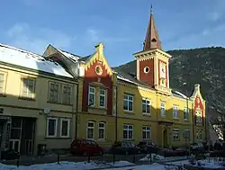 Der zweigeschoßige Ziegelbau hat Seitengiebel und mittig einen Turmaufsatz mit einer Uhr.