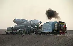 Eine Besonderheit ist der Transport von Sojus-Raketen mit Tiefladewagen auf dem Kosmodrom Baikonur.