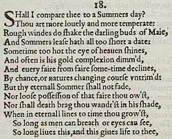 Sonett 18 greift Bilder aus der Natur auf und thematisiert Vergänglichkeit und die Rolle der Dichtung. Das Gedicht beginnt mit einer rhetorischen Frage, in der der oder die Geliebte mit dem Sommer verglichen wird. Anschließend verneint der Dichter jedoch eine Ähnlichkeit mit dem Sommer oder mit der Natur im Allgemeinen, zählt nicht wünschenswerte Extreme in der Natur auf (raue Winde, Hitze, Kälte) und erwähnt die Vergänglichkeit in der Natur. Das Sonett endet damit, dass der Dichter den Leser an die lebensspendende Macht der Lyrik erinnert:[7][8]