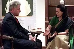Sonia Gandhi (सोनिया गांधी), geb. Edvige Antonia Albina Maino, (* 9. Dezember 1946 in Lusiana, heute: Lusiana Conco, bei Vicenza, Italien)[1] ist eine indische Politikerin.[2] Die gebürtige Italienerin ist die Witwe des ermordeten indischen Premierministers Rajiv Gandhi. 1998 bis 2017 war sie Präsidentin der Indischen Kongresspartei. Dieses Amt hatte sie vom 10. August 2019 bis zum 17. Oktober 2022 erneut inne.[3]