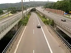 Südlich des Autobahnkreuzes setzt sich die A 535 als autobahnähnlich ausgebaute Landesstraße 74 Richtung Solingen/Remscheid fort.