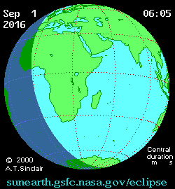 Die ringförmige Sonnenfinsternis vom 1. September 2016 war hauptsächlich in Zentralafrika sichtbar. Die Finsternis begann in der Mitte des Atlantik, der Pfad mit ringförmiger Sichtbarkeit erreichte Gabun nur 110 Kilometer weiter südlich als der Totalitätspfad der Finsternis von 2013. Anschließend überquerte die Zentralzone den afrikanischen Kontinent in Richtung Süd-Südost, dabei wurde neben Gabun die Republik Kongo, die Demokratische Republik Kongo, der Süden Tansanias, der Norden Mosambiks und die Mitte Madagaskars überstrichen. Bevor die Finsternis im Indischen Ozean endete, verlief ihre Zone ringförmiger Sichtbarkeit noch die Insel Réunion.