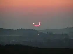 Hier ging die Sonne teilverfinstert als schmale Sichel auf. Die Sichel verbreiterte sich zusehends, und etwa eine Stunde nach Sonnenaufgang gab der Mond die Sonnenscheibe wieder vollständig frei. Die in Süddeutschland entstandene Aufnahme links zeigt die Sonnensichel um 5:21 Uhr MESZ, wenige Minuten nach dem Aufgang.
