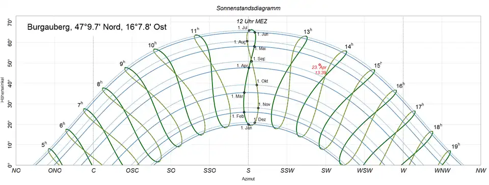Die Sonnenhöhe einer beliebigen Tageszeit kann aus dem Astronomischen Dreieck mittels Uhrzeit, Datum und Position des Beobachters berechnet werden.