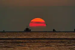- die Sonnenscheibe um etwa 0,6° gehoben erscheint, also mehr, als ihr Durchmesser ausmacht. Ohne die geschichtete Lufthülle der Erde wäre die untergehende Sonne schon nicht mehr zu sehen. Ihr scheinbarer Untergang wird für einen Sonnenstand von −50′ unter der Horizontalebene berechnet.