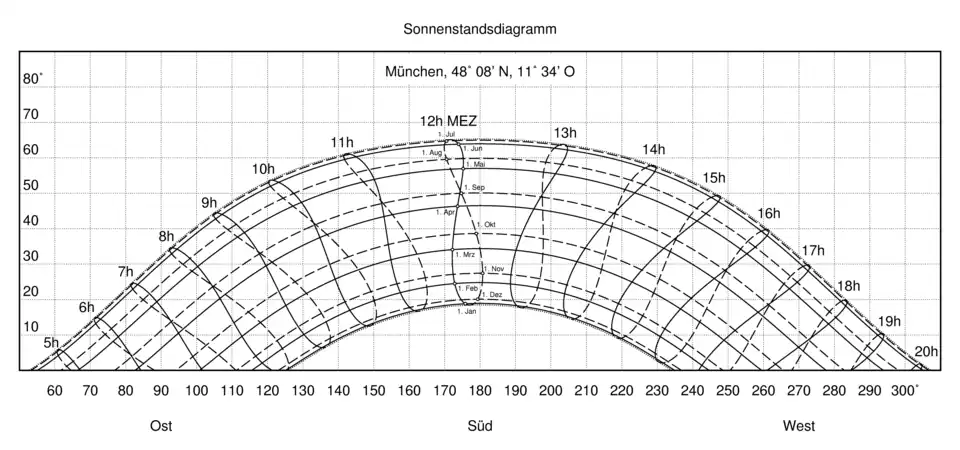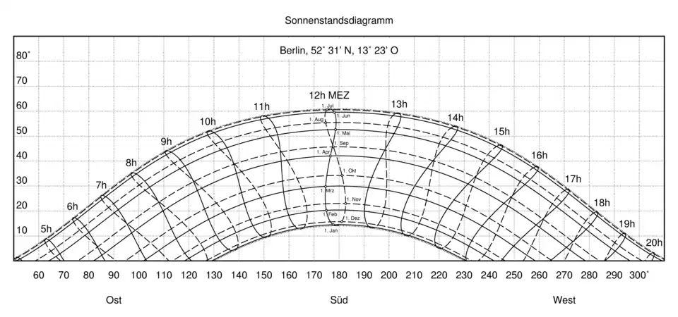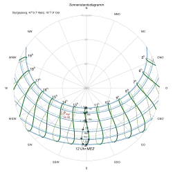 - ↑ Beispiel auch in: G.Waller: Sonnenstandsdiagramm und Strahlungsbilanzen, Seite 8: Sonnenstandsdiagramm für Kiel ( vom 28. Februar 2013 im Internet Archive) (PDF 337 kB)